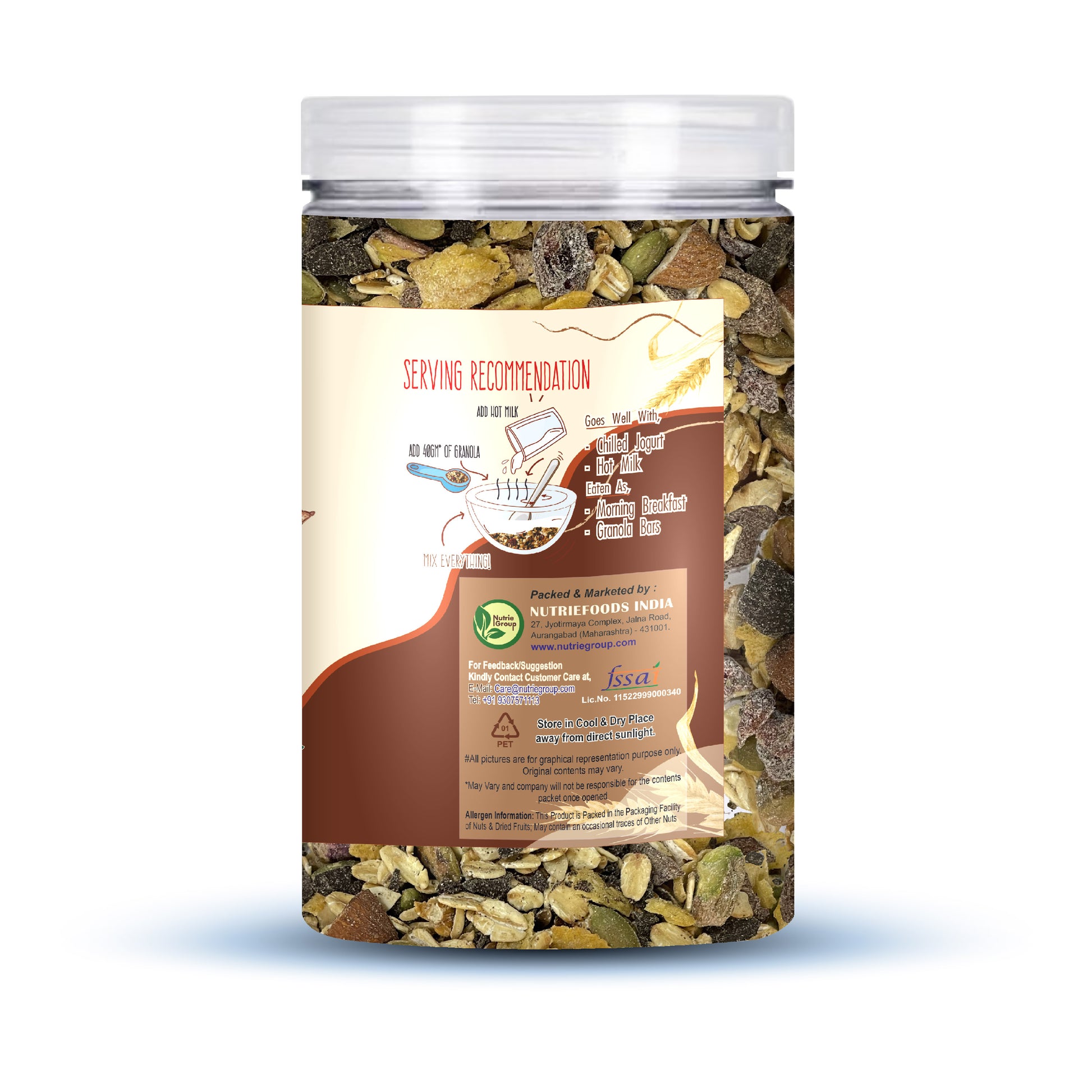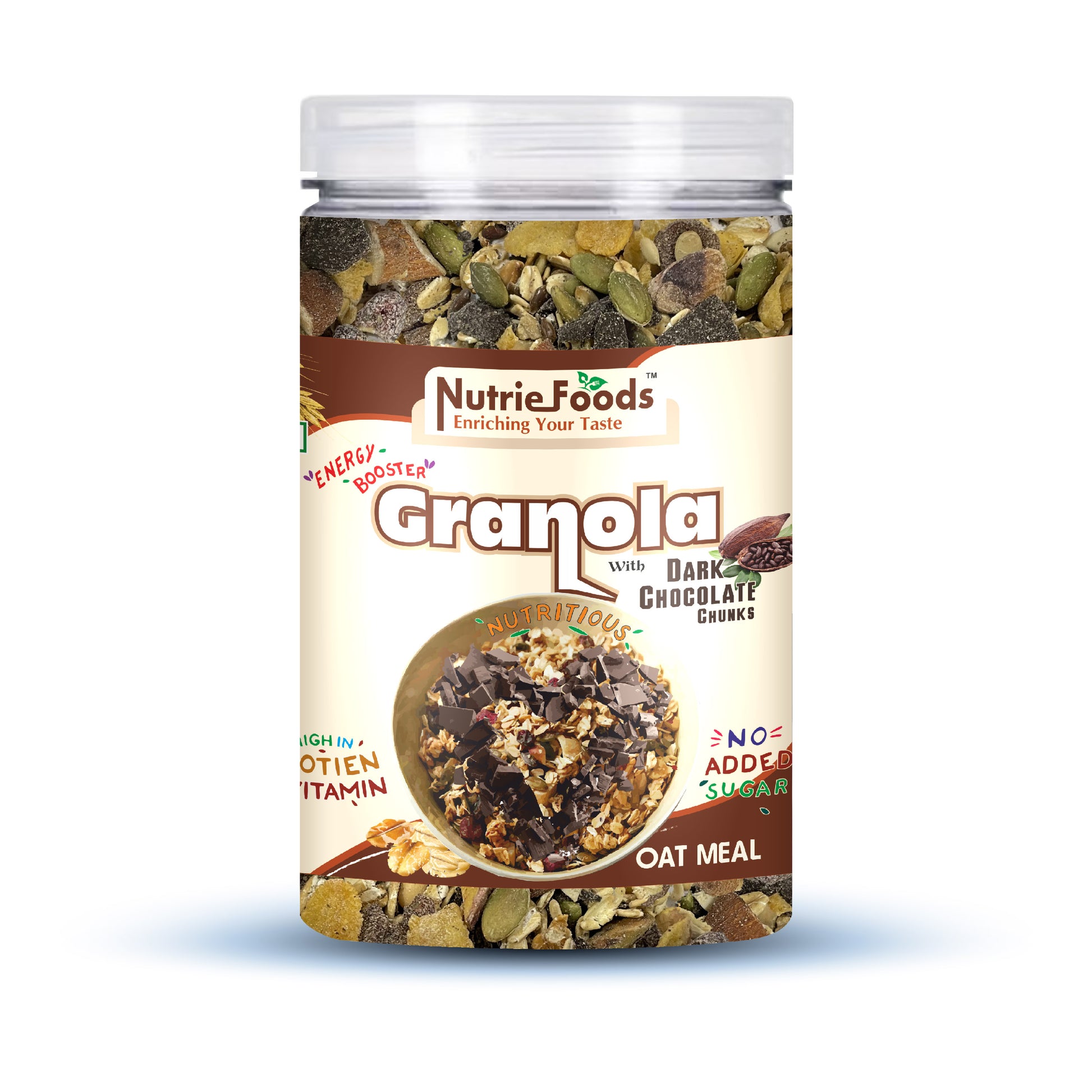 Nutriefoods Oat Meal Granola is made with premium quality ingredients such as, Oats, Corn Flakes, Cranberries, Nuts- Almonds, Cashews, Pistachios and Seeds- Pumpkin Seeds, Watermelon Seeds, Flax Seeds, and Chia Seeds. All the ingredients are blended together with Dark Chocolate Chunks (No Sugar Added) to provide the most healthy and nutritious breakfast for your loved ones.
