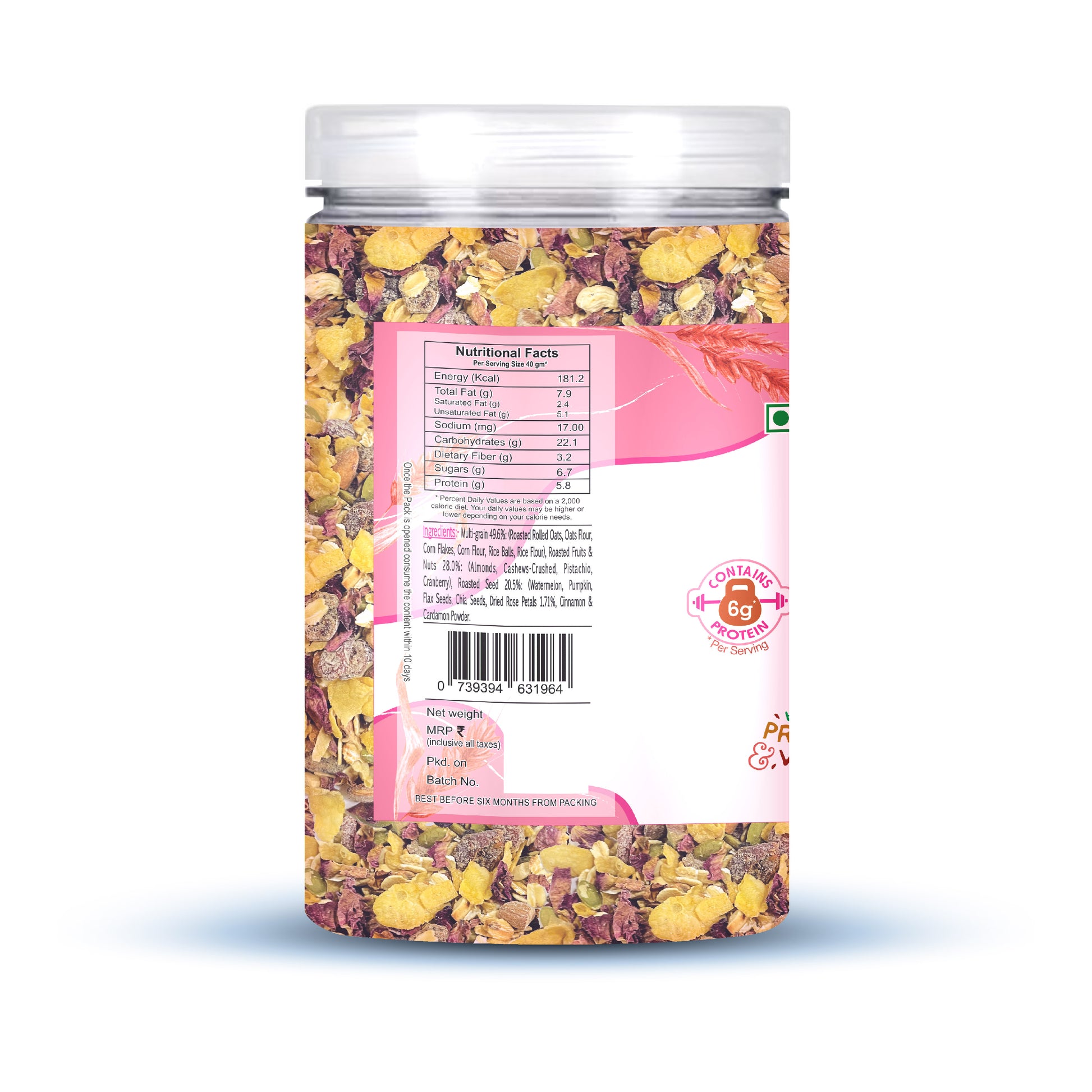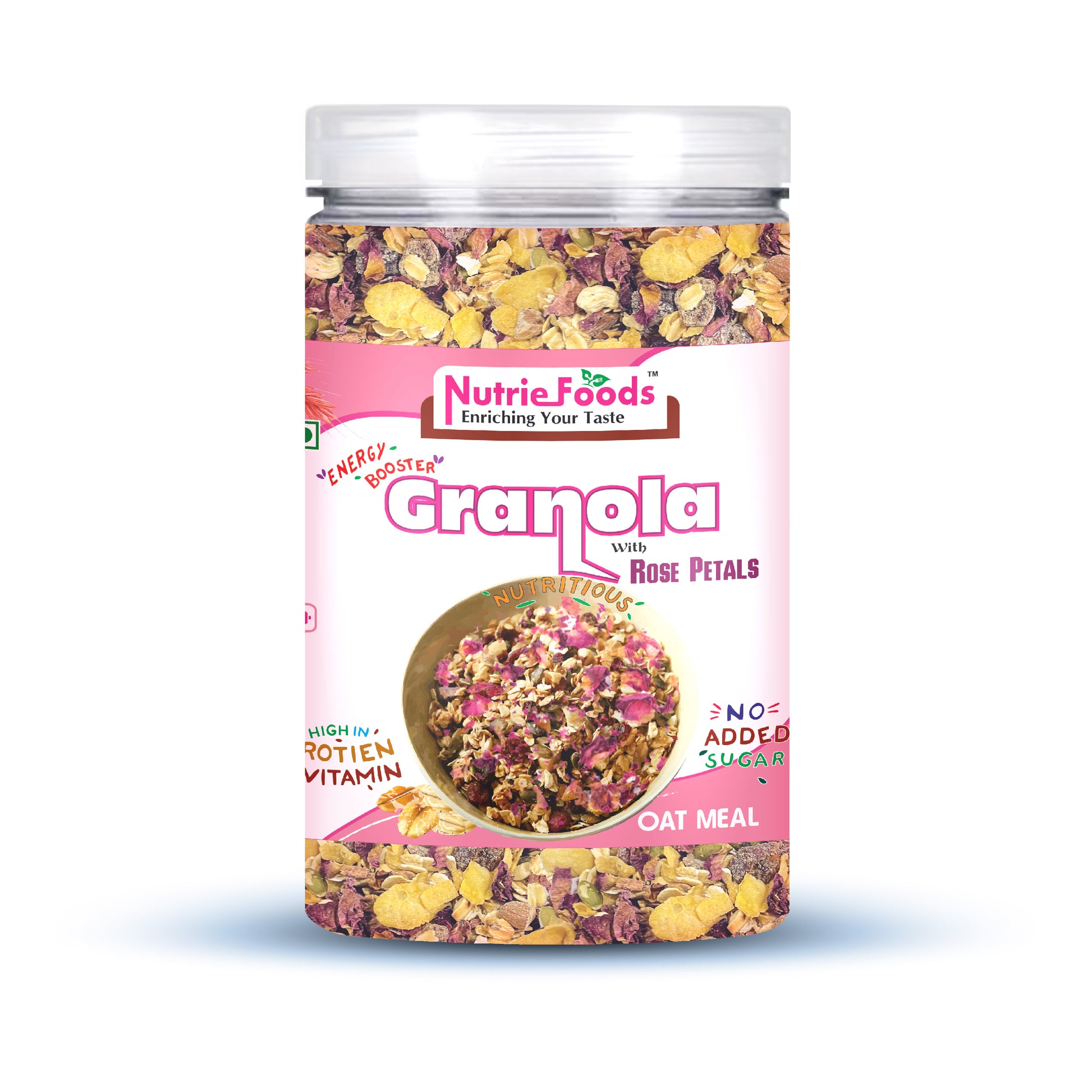 Nutriefoods Oat Meal Granola is made with premium quality ingredients such as, Oats, Corn Flakes, Cranberries, Nuts- Almonds, Cashews, Pistachios and Seeds- Pumpkin Seeds, Watermelon Seeds, Flax Seeds, and Chia Seeds. All the ingredients are blended together with Sun Dried Rose Petals (No Sugar Added) to provide the most healthy and nutritious breakfast for your loved ones.