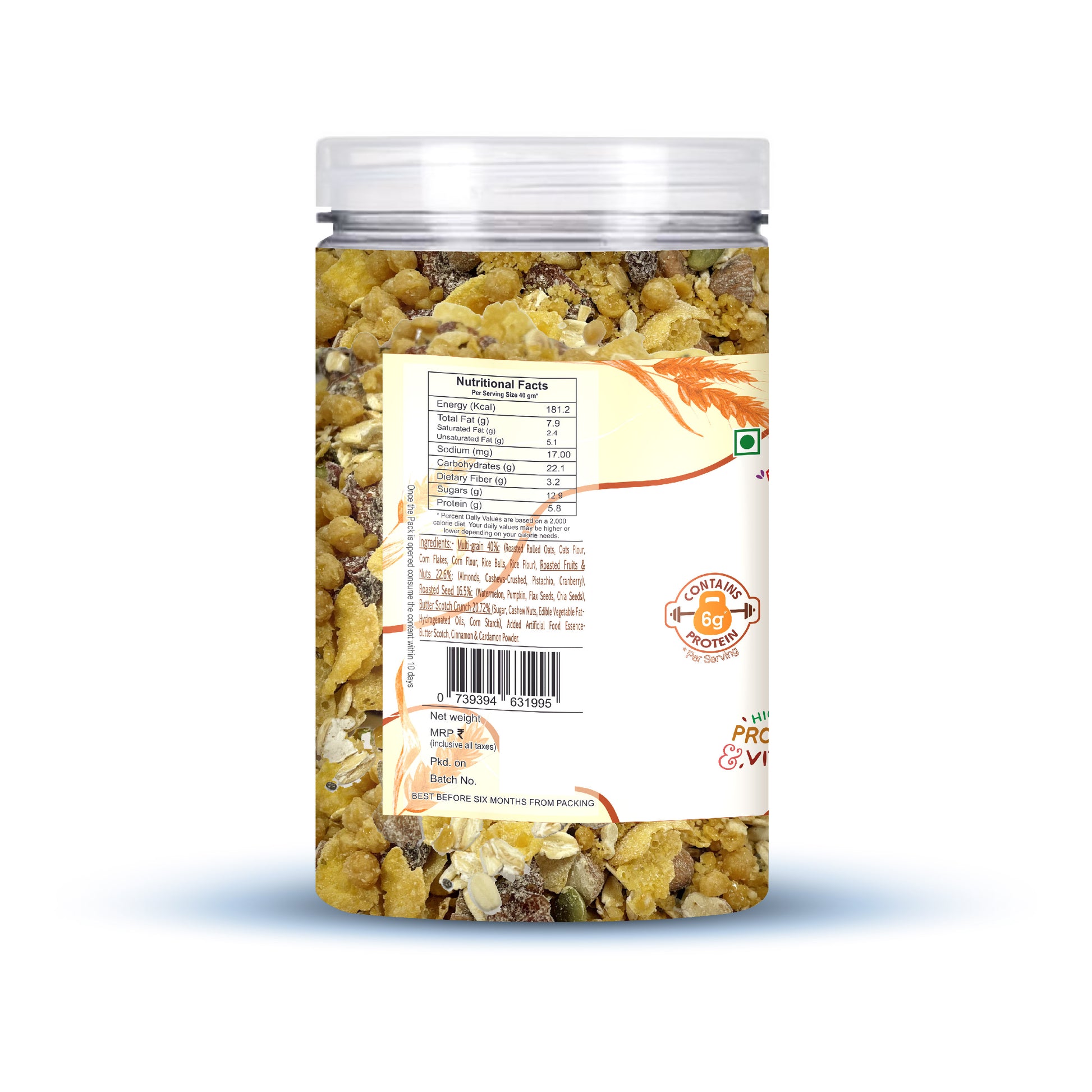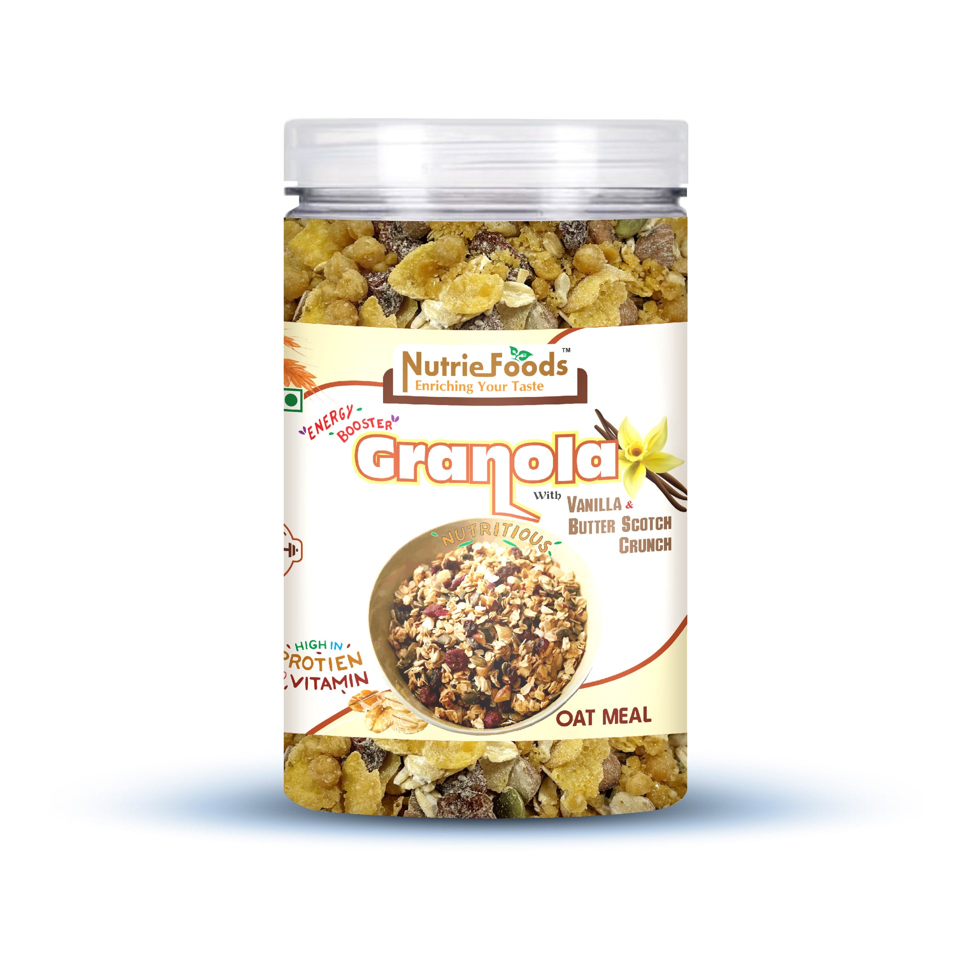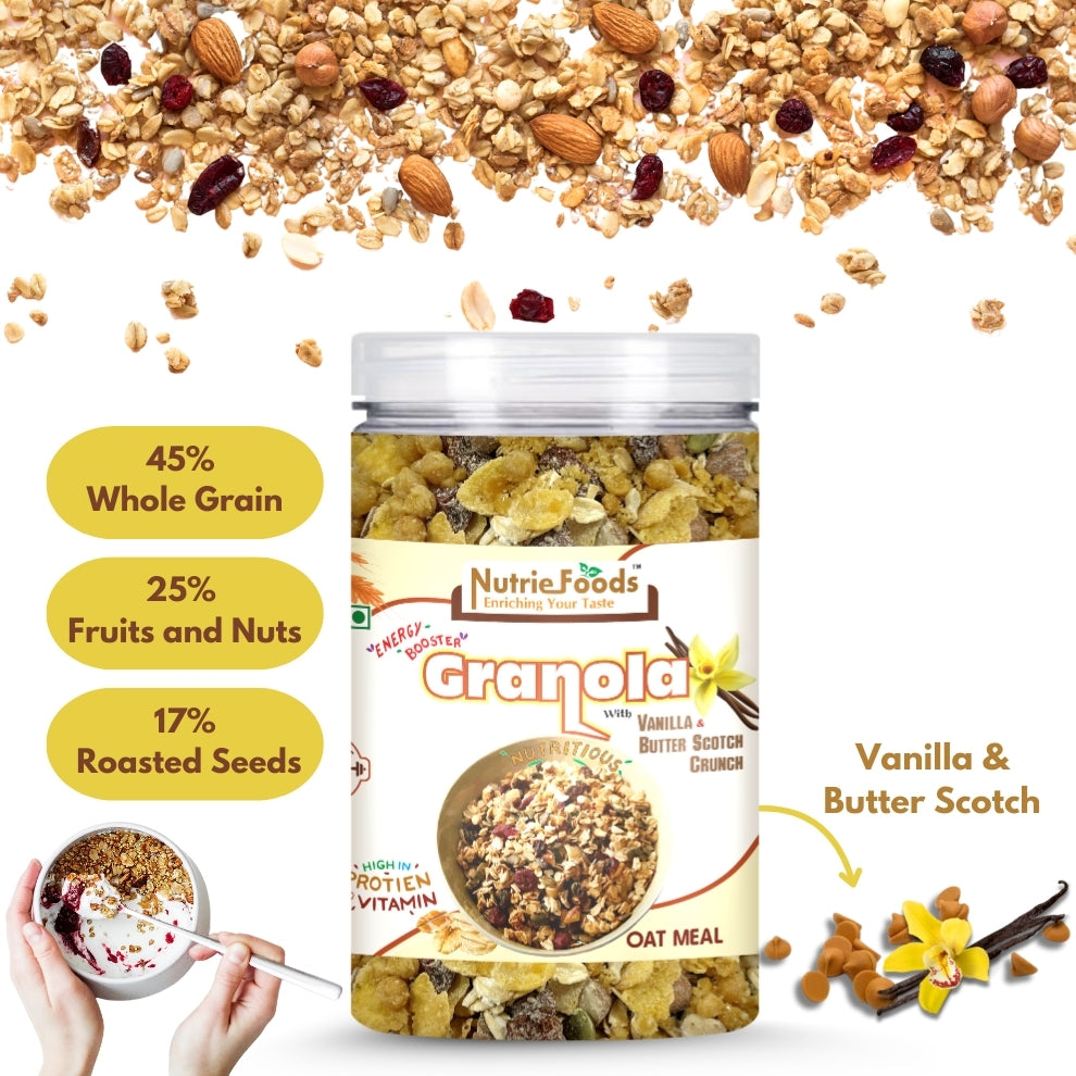 Nutriefoods Oat Meal Granola is made with premium quality ingredients such as, Oats, Corn Flakes, Cranberries, Nuts- Almonds, Cashews, Pistachios and Seeds- Pumpkin Seeds, Watermelon Seeds, Flax Seeds, and Chia Seeds. All the ingredients are blended together with Vanilla and Butterscotch Crunch to provide the most healthy and nutritious breakfast for your loved ones.