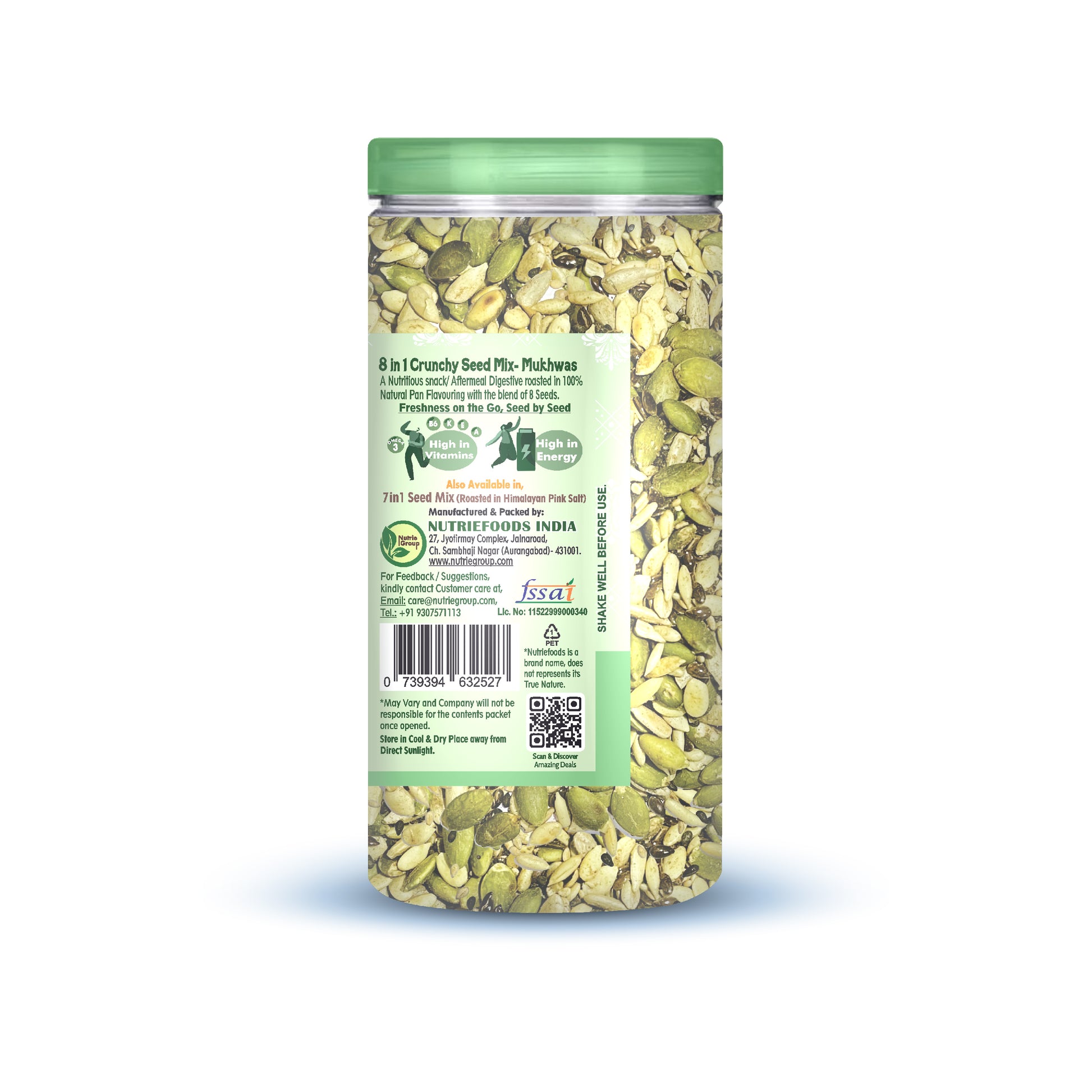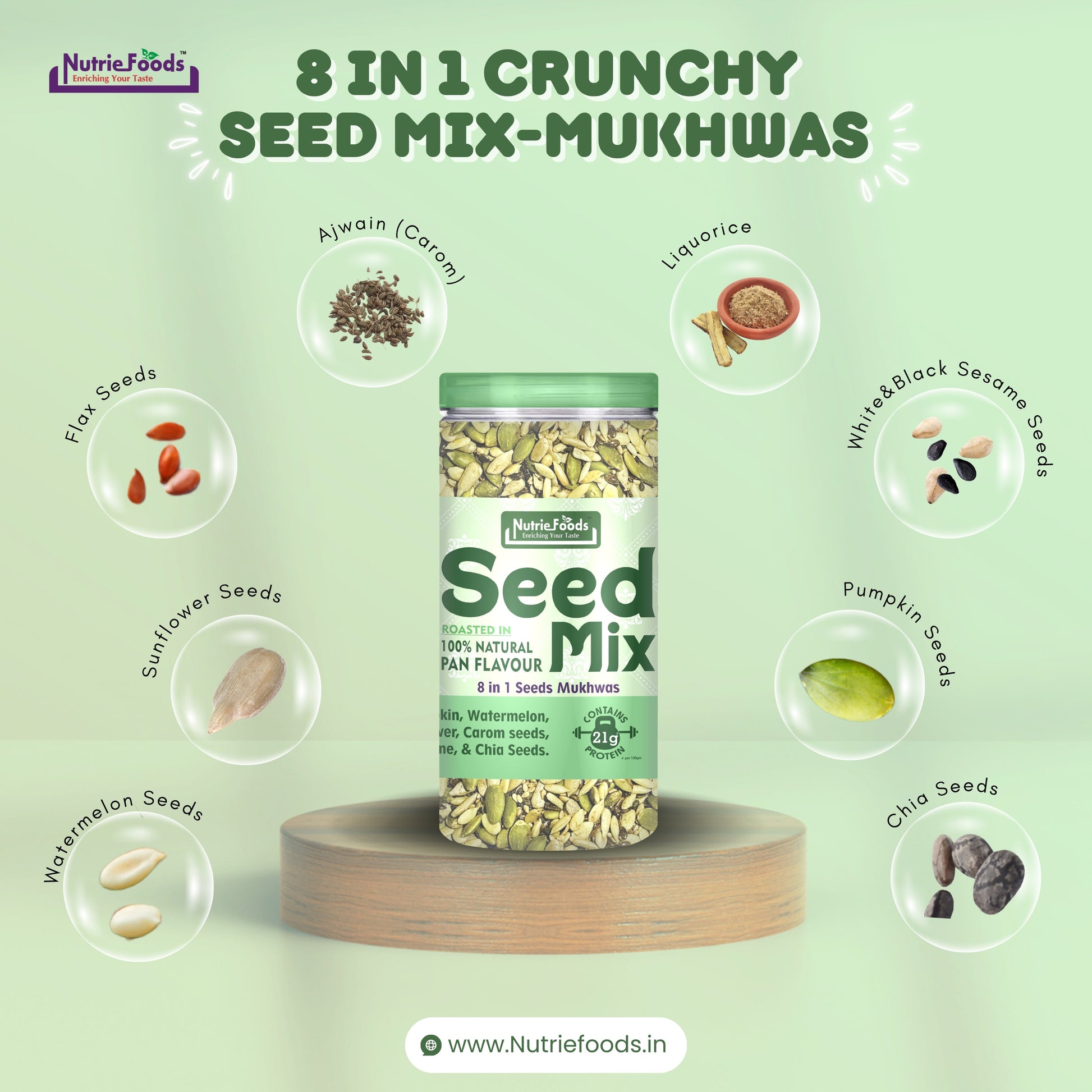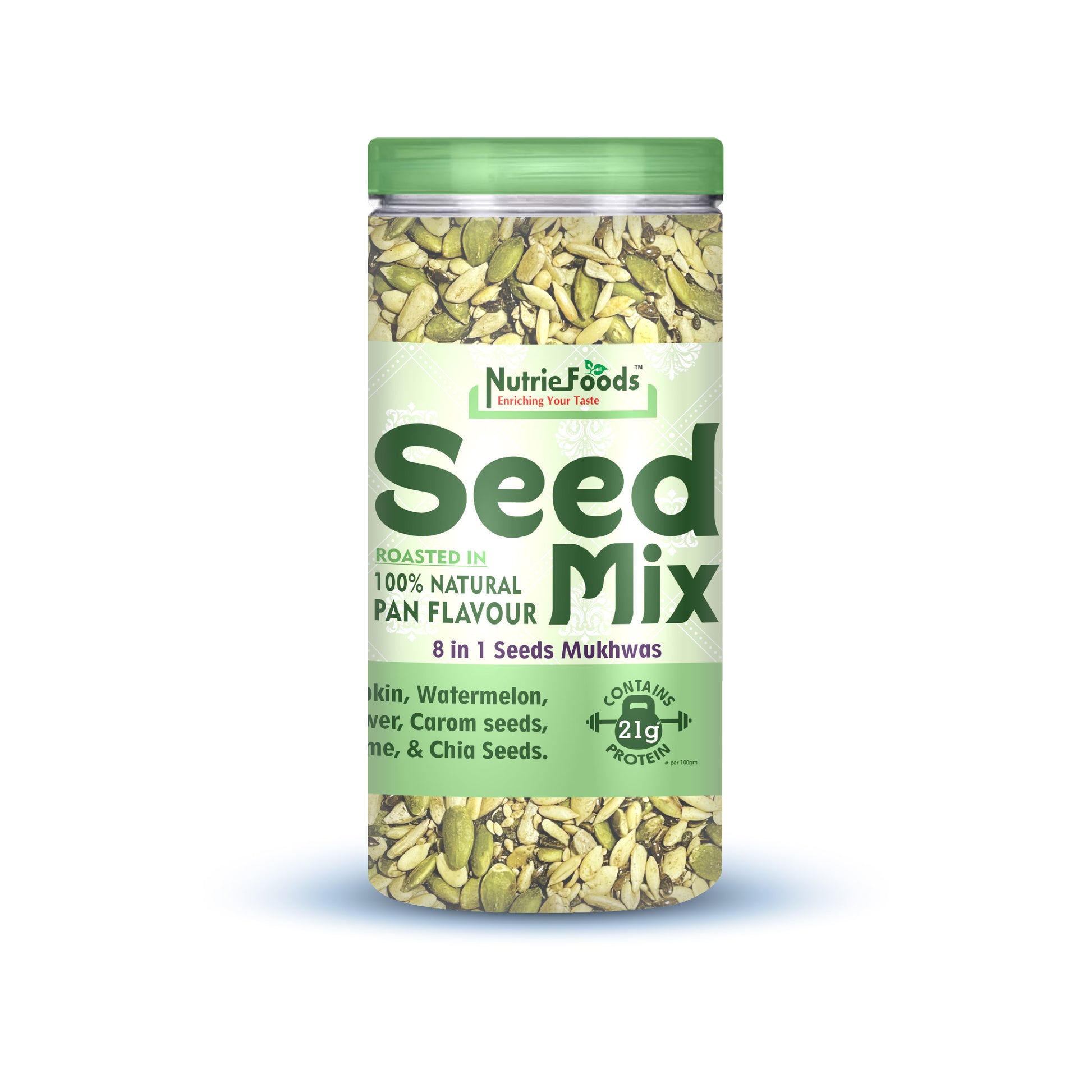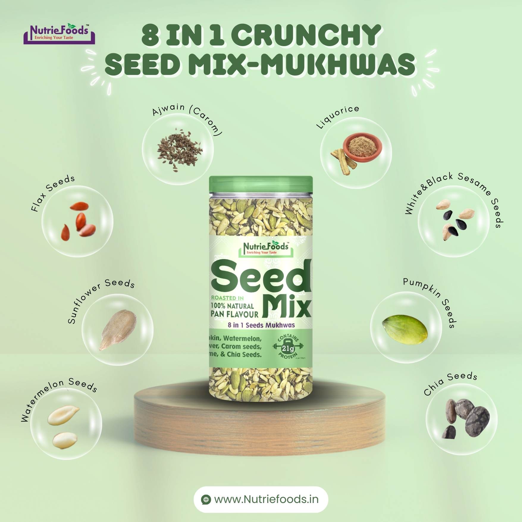 Nutriefoods Nutritious Crunchy Seed mix Mukhwas is made with 8 types of nutritious seeds containing Pumpkin, Flax, Sesame, Watermelon, Sunflower, Ajwain & Chia Seeds together with 100% Natural Plant based Pan Flavouring including Mulethi, Cinnamon, Menthol, Belpulp.ย