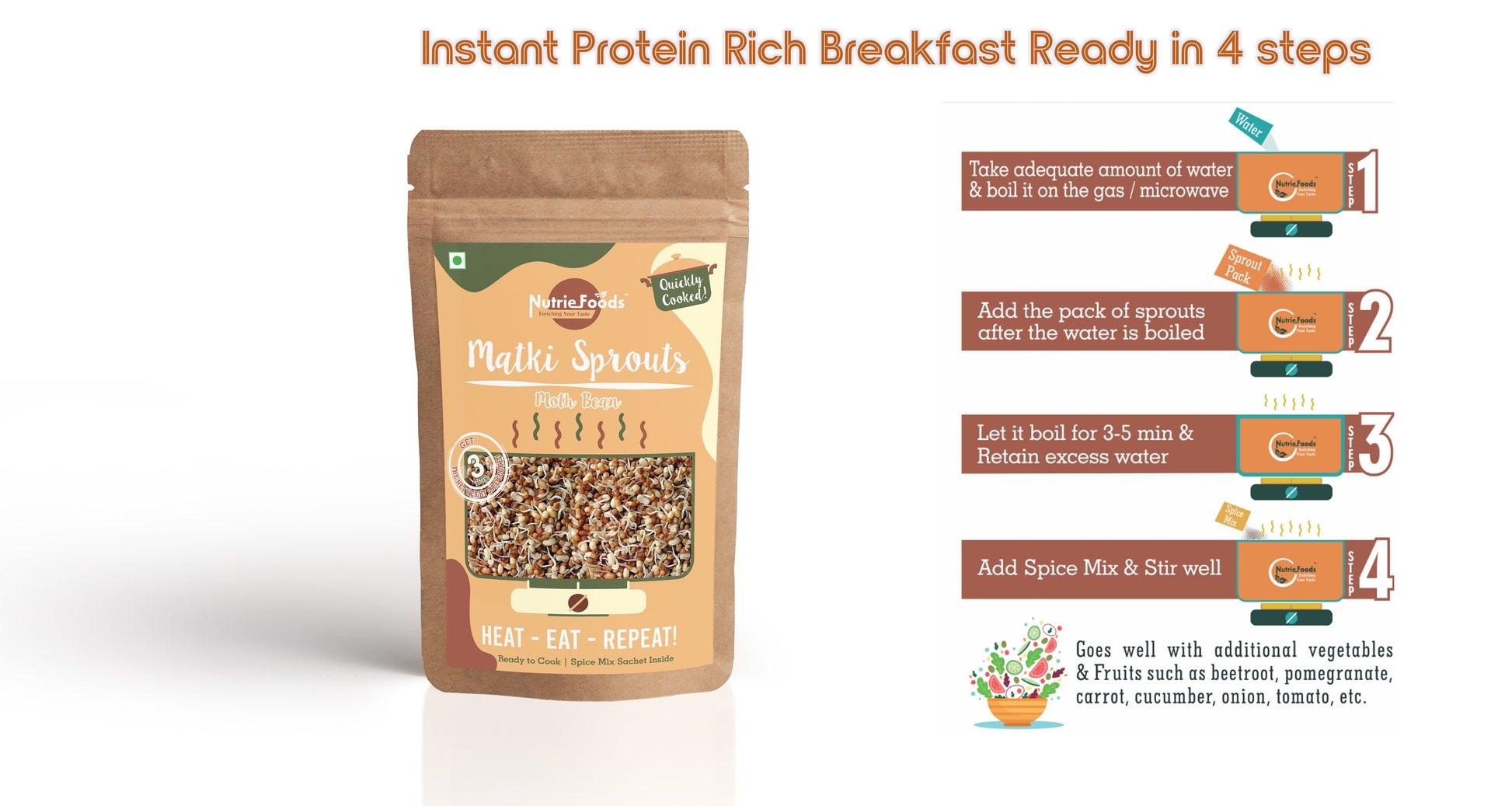 Nutriefoods Ready to cook Sprouts are made with a unique process known as dehydration. This process removes the moisture (Water Content) from the sprouts while preserving their nutritional values. Additionally, Nutriefoods Ready to Eat sprouts are free of any added chemicals or additives, and are organically processed making them a healthy and safer choice.ย