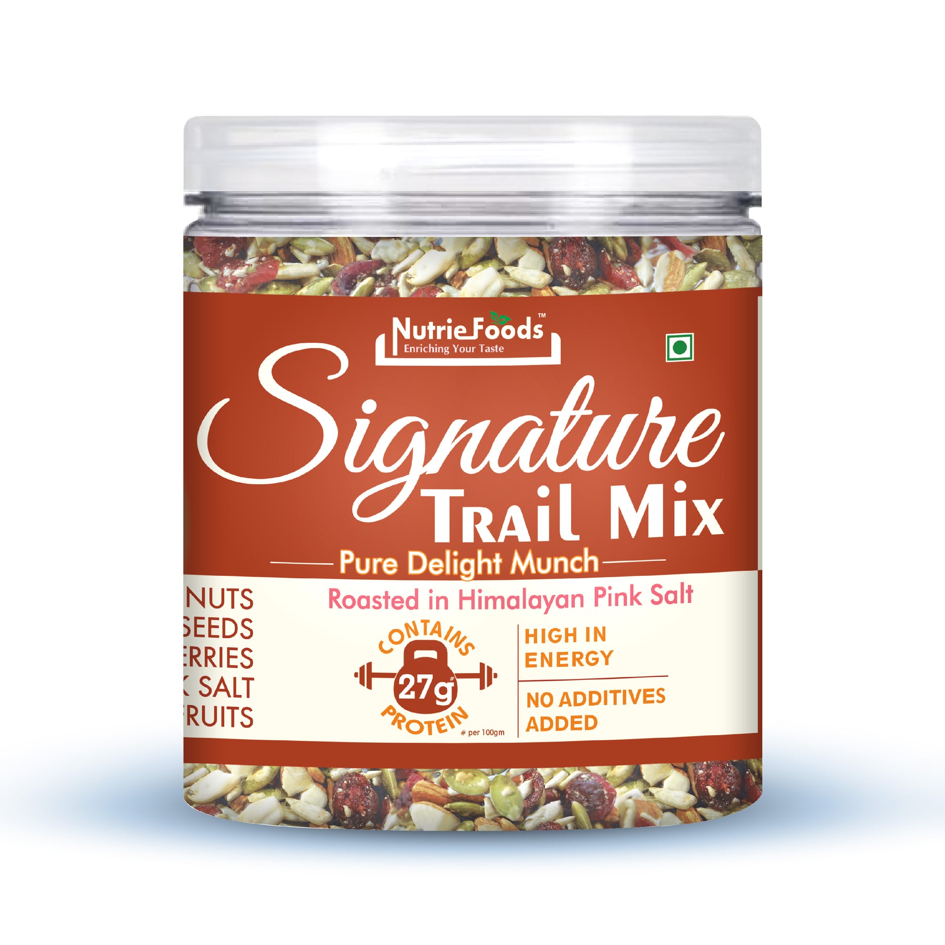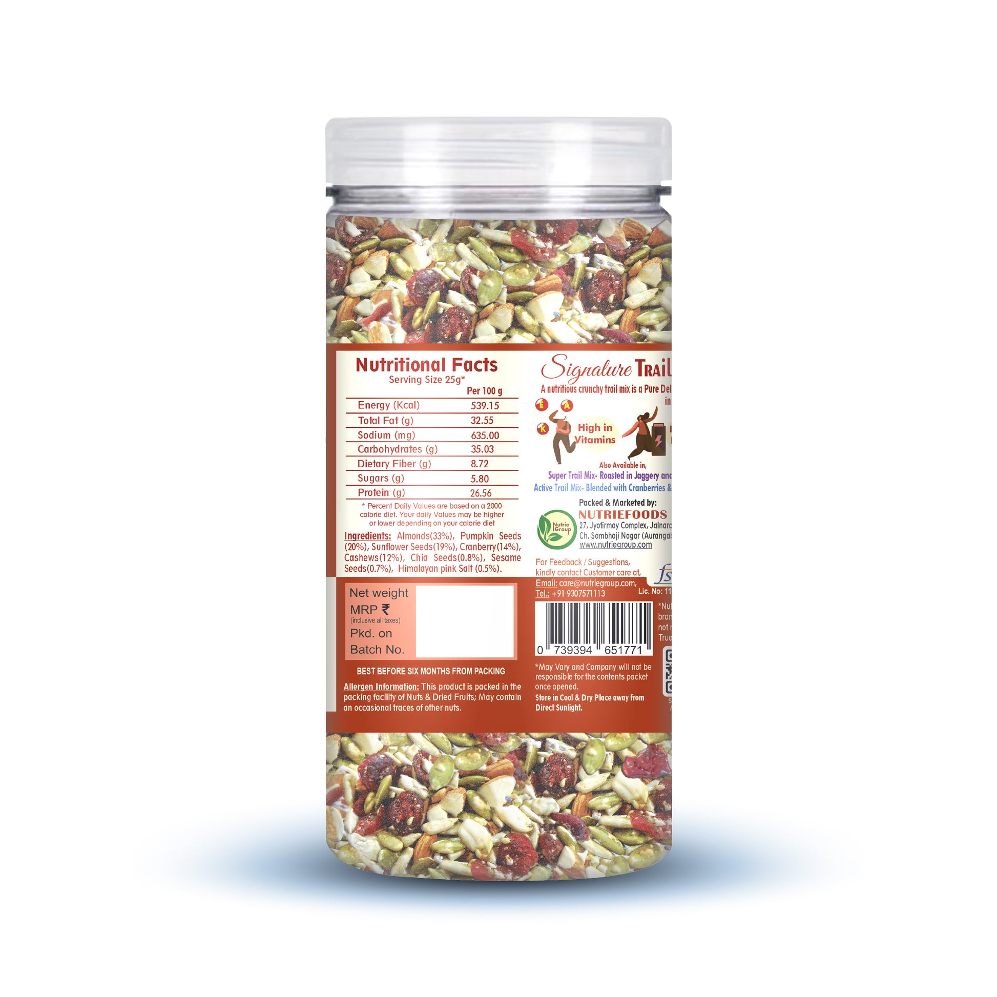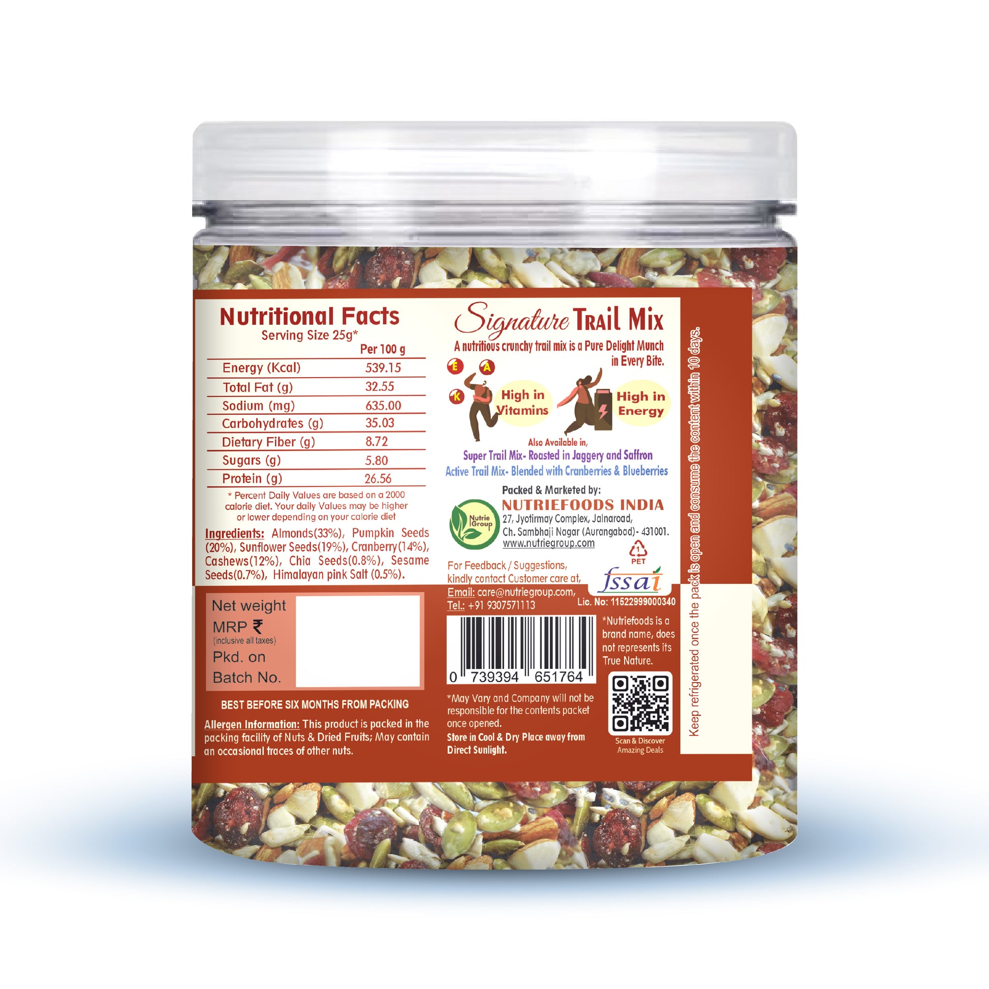 Nutriefoods Signature Trail Mix is Light and Crunchy dryfruit mix with Premium selection of Californian Almonds, Cashews Pumpkin, Sunflower, Sesame and Chia Seeds; Blended and Roasted together with Cranberries and Himalayan Salt. It is a very good source of Vitamin and Protein in your daily diet. Recommended 2 to 3 spoons a day.